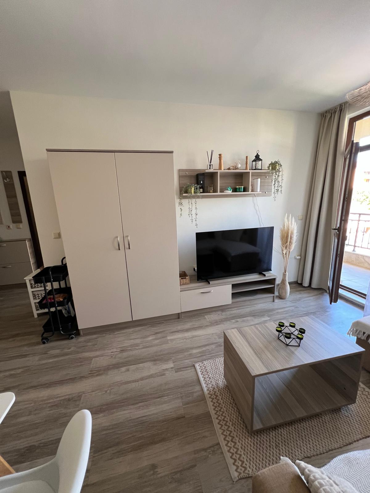 Апартаментът се предлага напълно обзаведен и оборудван, с функционално разпределение - входно антре, просторна всекидневна с кухненски бокс и трапезария, една спалня, баня с тоалетна и душ кабина, както и голяма тераса с изглед към вътрешния двор и басейна.