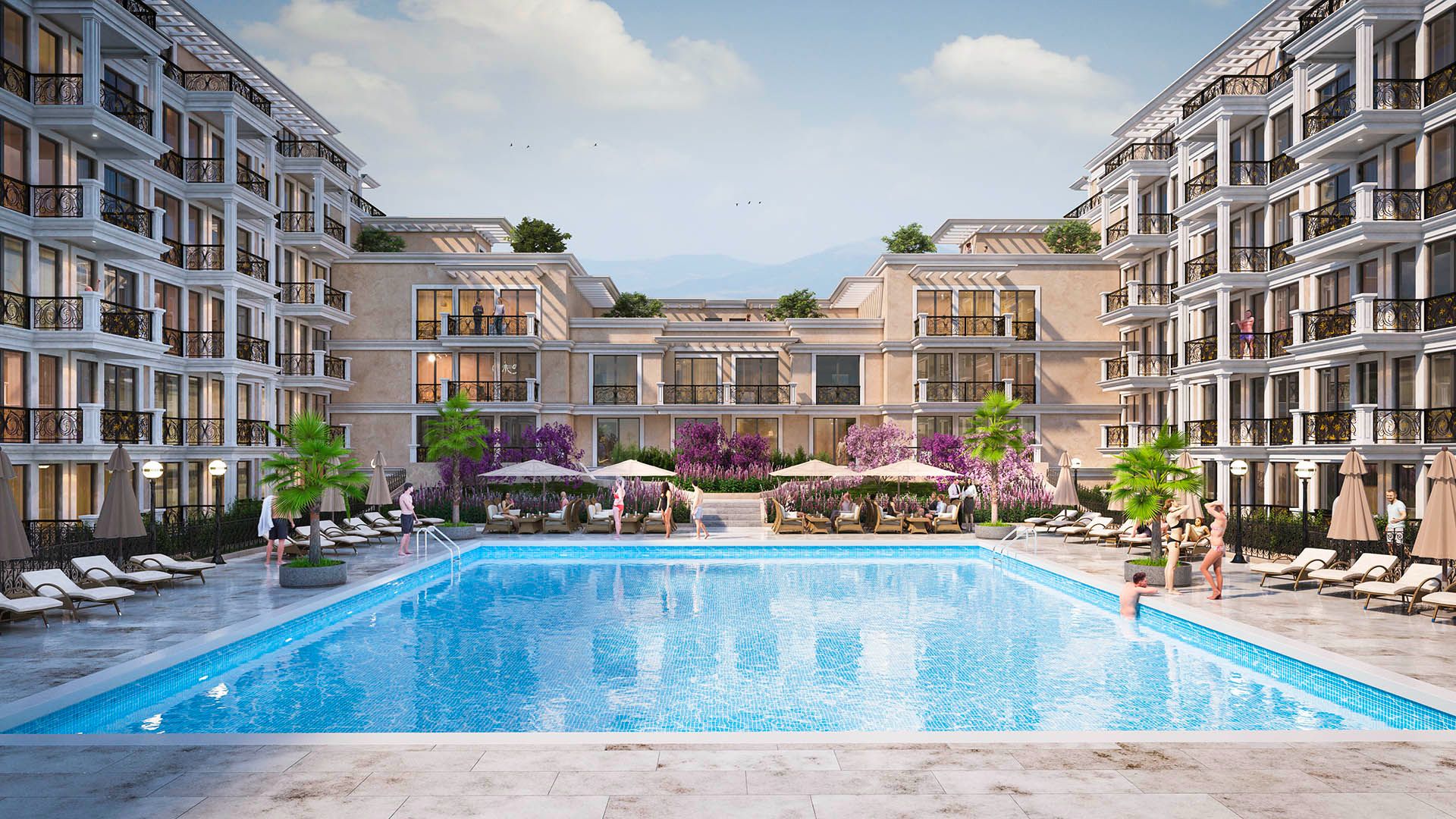At the disposal of the owners and guests there is an outdoor swimming pool for adults with a children's section, an elevator, relaxation and sunbathing areas with sun loungers, richly landscaped areas, a children's playground, controlled access, 24-hour security and video surveillance, parking.
